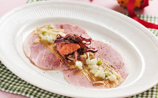 Julskinka med senapsvinägrett, cheddarost, apelsin och rödkål