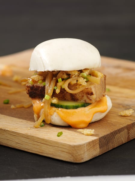 Supermör ingefärskarré i steambun med picklad rättika och kimchidressing