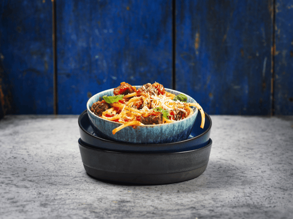 Spagetti med Gårdsköttbullar, mustig tomatsås och mozzarella