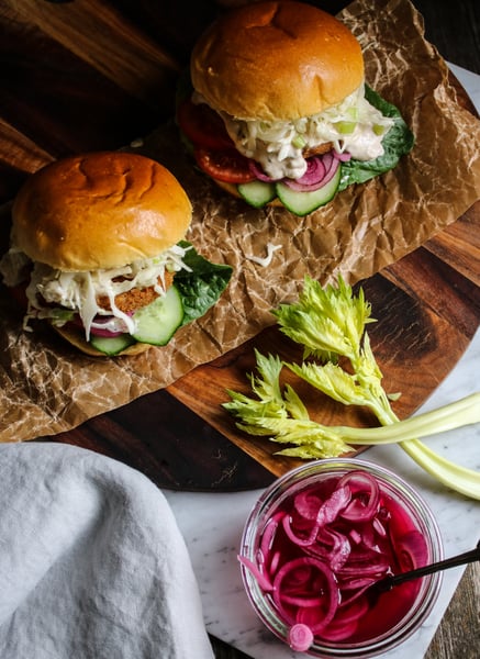 Krispig ärtburgare i Potato Bun, picklad rödlök, BBQ-dressing