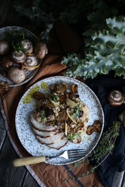 Svamprisotto med honung- och vitlöksglaserad kotlettrad