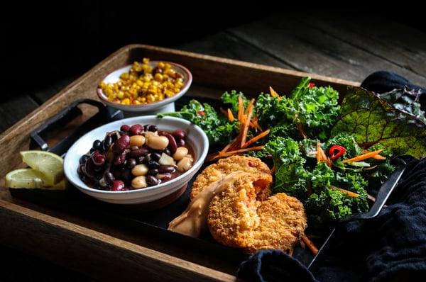 Texmexburgare med BBQ-bönor, kål-ceviche chilirostad majs och chilidressing