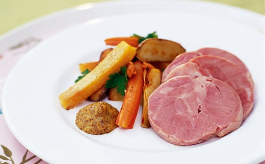 Rimmad fläsklägg med rostade rotfrukter och senap