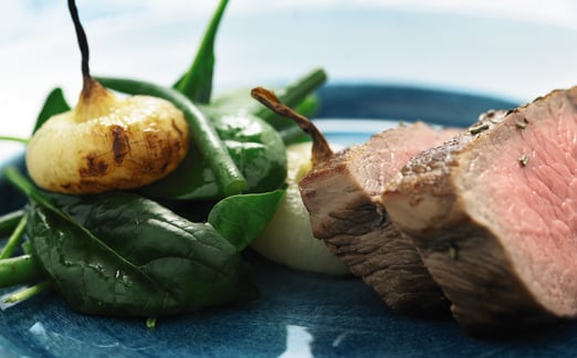 Rosmarinstekt kalventrecôte med bakad pärllök, spenat och haricots verts
