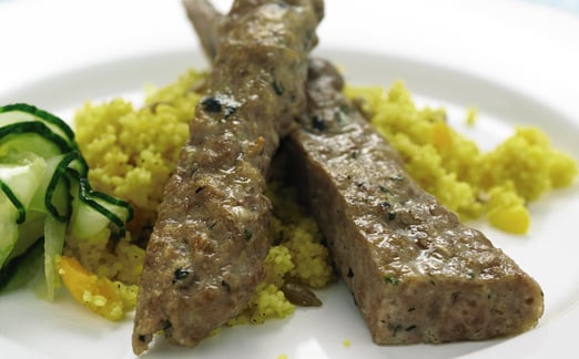 Lammfärskebab, kryddig couscous och citronrimmad gurka