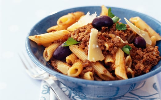 Chilistekt nötfärs med pasta penne, svarta oliver och parmesan