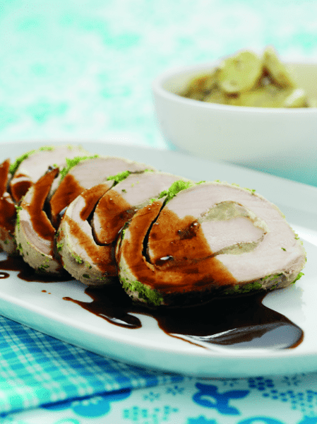 Äppelfylld kotlettrad med senapsstuvad potatis
