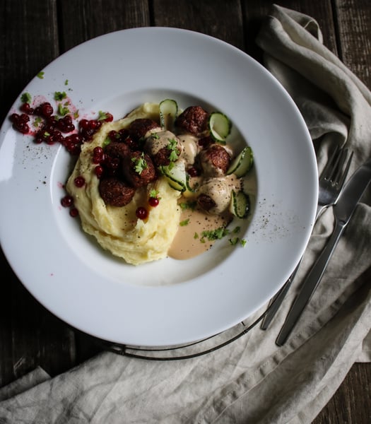 Ärtbollar med potatispuré, rostad vitpeppargräddsås, pressgurka, rårörda lingon och persilja