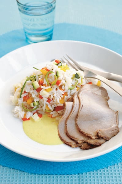 Skär köttet i skivor. Lägg på bleck och värm i 80°C ugn med ångpuffar tills temperaturen är 70°C mellan skivorna. Koka riset i grönsaksbuljong. Fräs äpple, lök och curry i smör i en gryta.Tillsätt vatten, hönsbuljong och äppeljuice och koka ihop något. Rör i créme fraiche, koka upp och red med maizena. Smaksätt med salt och peppar. Vänd ner grönsakerna i riset. Servera det med kotlettskivor och sås.