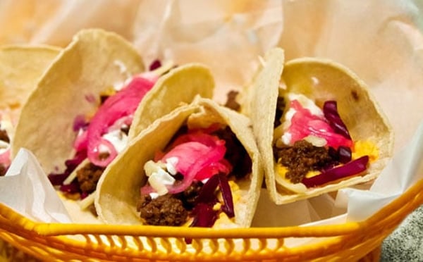 Toppa med syltad rödlök, gräddfil och riven cheddarost.