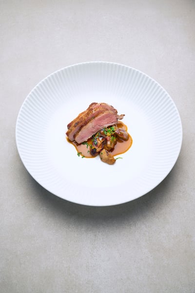 Salta och peppra pluman riktligt, stek i olja i stekpanna på hög värme tills köttet fått en fin gyllenbrun yta. Vänd och låt få färg. Gå i med smör, krossade vitlöksklyftor och timjan. Ös köttet till 58°C. Lyft pluman ur pannan och låt vila upp till 65°C.