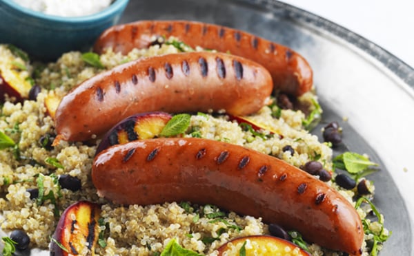 Grillad Txistorra, fetayoghurt och quinoa med persika och mynta