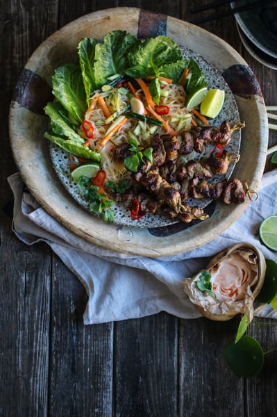 Grillade karréspett med smak av citrongräs och krispig nudelsallad