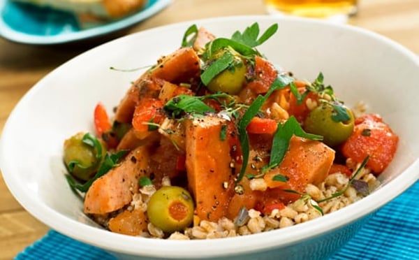 2. Blanda ner korv, krossade tomater, äppelmos och buljong. Låt puttra i några minuter. Rör ner oliver, rivet apelsinskal och saften från apelsinen. Smaka av med salt och peppar.