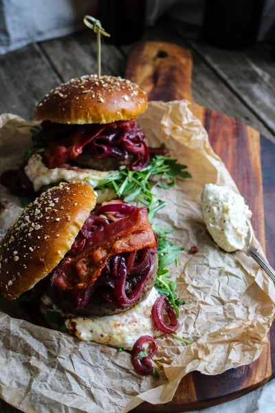 Högrevsburgare med rödvinskokt rödlök, bacon, ost och rucola