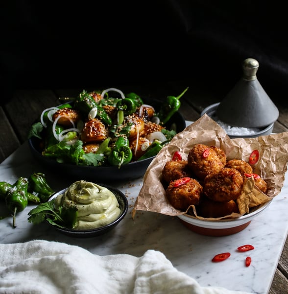Jalapenonuggets med rostad Sweet- Sour-BBQ-potatis