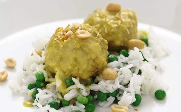 Låt ströbrödet stå och svälla i mjölken ca 10 minuter. Blanda ihop med resten av ingredienserna till färsen och forma till frikadeller, 2-3 per portion. Sjud frikadellerna i kycklingbuljong, ca 10 minuter. Innertemperaturen i frikadellerna ska vara 70°C. Fräs lök och äpple i olja utan att det tar färg, tillsätt curry och fräs ytterligare några minuter. Häll på vätska och buljongpasta, koka 15-20 minuter. Mixa och smaksätt med salt. Blanda det kokta riset med ärtor och persilja och servera till frikadellerna och currysåsen.