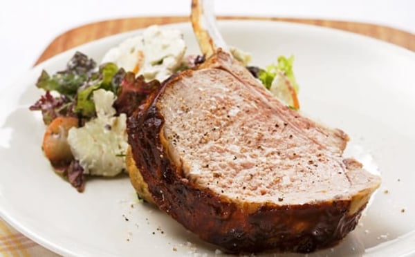 Servera de grillade kotlettracksen med äppel- och blomkålssalladen och ev lite klyftpotatis.