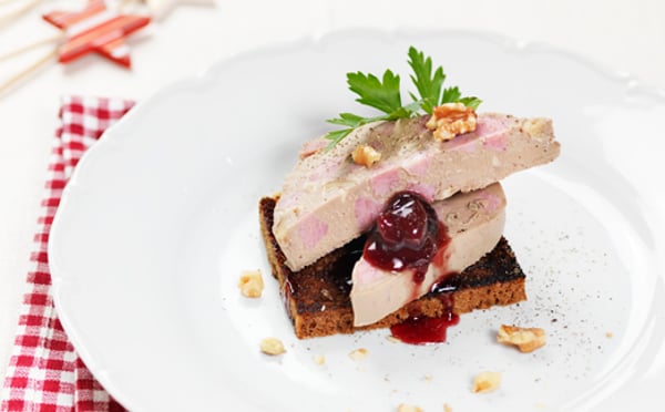 8. Vid servering; Skär upp terrinen i ca 1 cm tjocka skivor med en varm kniv och lägg på en skiva nyrostad kavring. Toppa med en god körsbärsmarmelad och drick en iskall glögg därtill.
