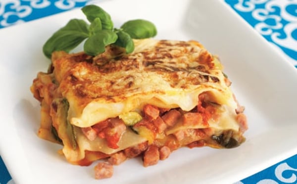 Koka upp de krossade tomaterna. Smaksätt med oregano, vitlök och socker. Låt koka i 30 minuter. Smaksätt med salt och peppar. Späd eventuellt med lite vatten. Gör en bottenredning. Tillsätt mjölk och koka upp under omrörning. Ta bort kastrullen från värmen och rör i osten. Smaka av med salt, peppar och eventuellt lite riven muskot. Fräs lök, zucchini, aubergine och skinka i olivolja. Smaksätt med paprikapulver, salt och peppar. Varva lasangeplattorna med béchamelsås, tomatsås och grönsaker på bleck. Avsluta med béchamelsås. Grädda i 150°C ugn i ca 30 minuter.
