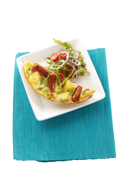 Koka potatisen i saltat vatten. Vispa ägg, mjölk, vetemjöl och salt i en bunke. Snitta purjolöken och skölj mellan bladen, strimla. Skär potatisen i bitar. Stek korven i olja och tillsätt lök och potatis. Stek utan att ta färg, peppra. Häll omelettsmeten i pannan med stekta ingredienserna. Sänk värmen och låt stå ett tag. Grädda sen av den snabbt i ugn med grillfunktion tills den får lite färg. Blanda tomater och rödlök med olivolja, salt och peppar. Skölj ruccolan och blanda med tomaterna. Servera som topping till frittatan.