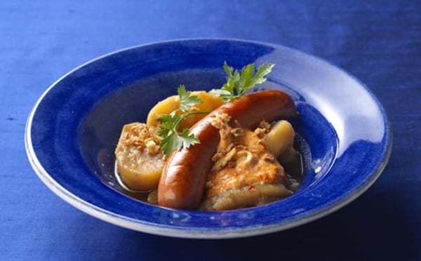 Lunchkorv med ölkokt potatis, paprikakräm och rostad lök