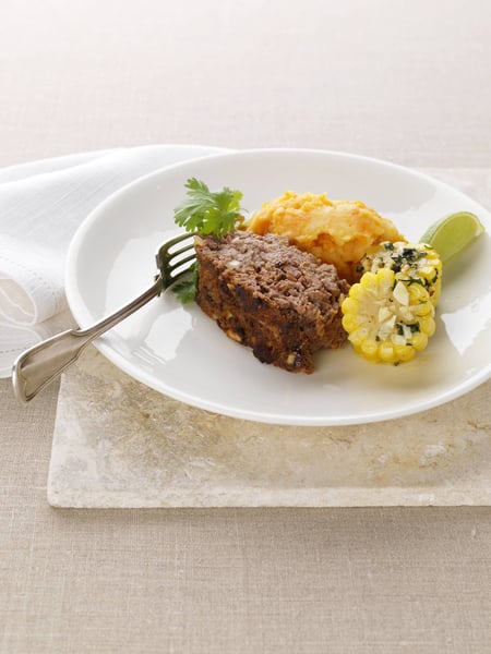 Servera köttfärslimpan med sötpotatismos och majsstubbar. Garnera gärna med en limeklyfta och färsk koriander.