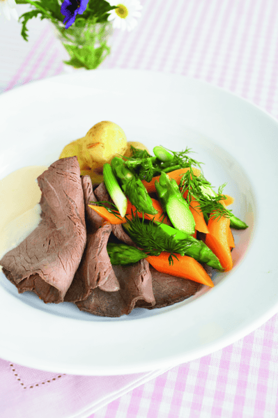 Nötstek med dillslungade primörer, citronsås och kokt potatis
