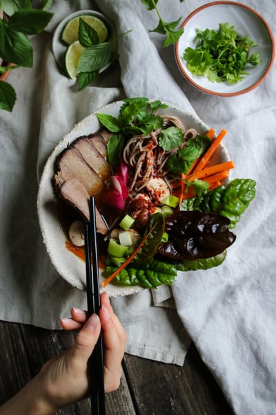 Koka sobanudlar och skiva grönsaker tunt, lägg på ett fat så att alla får plocka ihop sin egen topping med nudlar, grönsaker, kött och örter.
