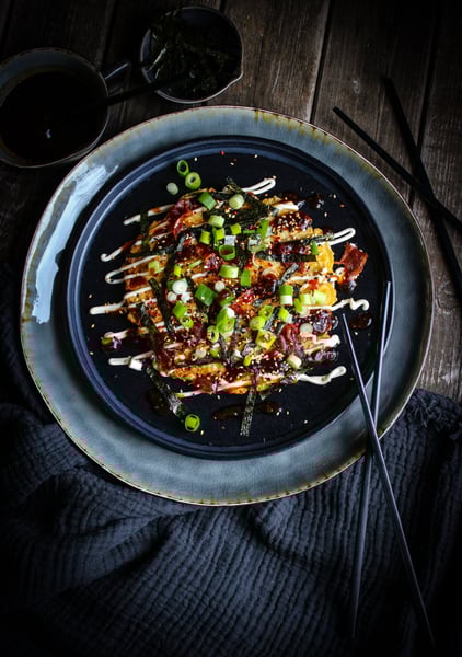 Okonomiyaki - Japansk pannkaka med bacon och kål