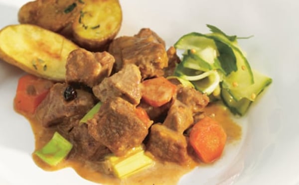 Blanda ättika, socker, vatten, senapsfrön, pepparrot och persilja i en bunke. Vänd ner gurkan och ställ under press i ett par timmar. Bryn köttet tillsammans med lök och vitlök. Tillsätt porter, vatten, kalvfond och kryddor. Låt koka tills köttet är mört ca 45 minuter. Häll i grädde och svartvinbärssaft. Red av med maizena till önskad konsistens och smaksätt med salt och peppar. Servera portergrytan med pressgurka och kokt potatis.