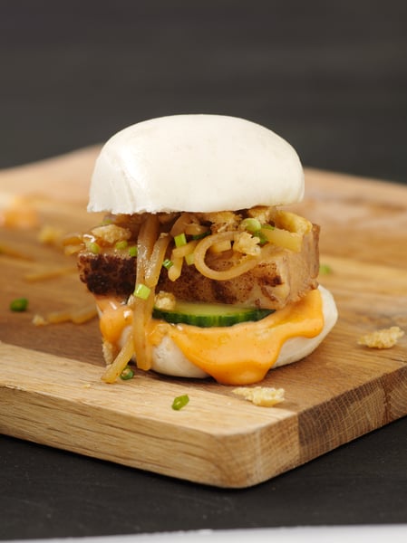 Dela på brödet. Lägg på lite majonnäs och en gurkskiva. Toppa med fläskskiva och potatispickles. Lägg på locket.