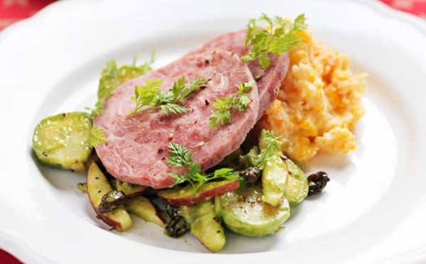 Rimmad fläsklägg med syrlig äppel- och brysselkålssallad