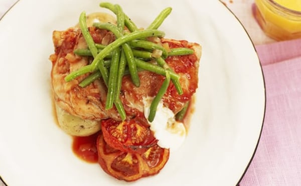 4. Servera Scan Skinkstek med het BBQ-sås, bakad tomat och rippla svalkande gräddfil över. Små hela rostade potatisar samt marinerade gröna bönor till.