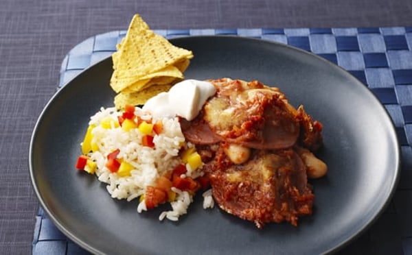 Tacogratinerad nötkorv med paprikaris och gräddfil