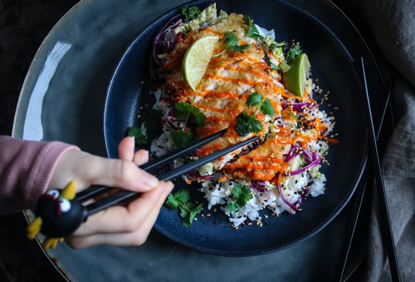 Skär tonkatsun i strimlor och servera med ris, kålsallad och toppa med srirachamajo, koriander och lite lime att pressa över.