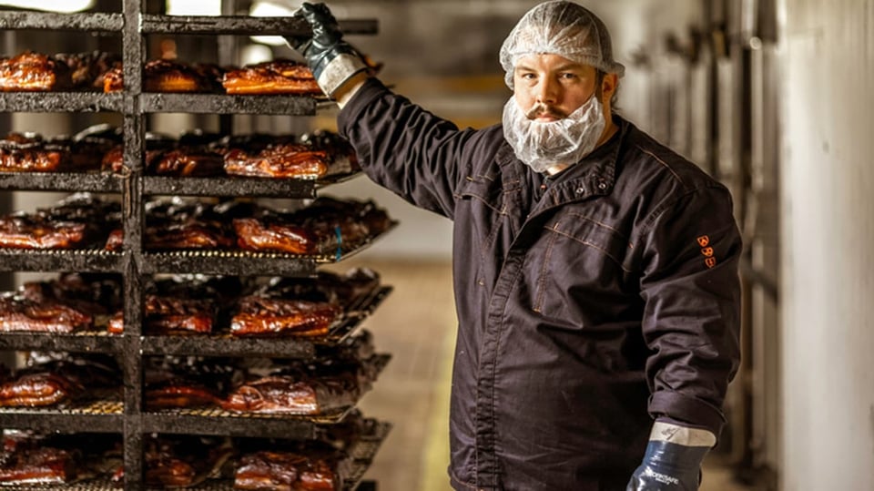– När den fuktiga eneflisen kommer på börjar det ryka ordentligt, och det är ju precis så det ska vara. Så mycket rök som möjligt. Sen får det stå så i drygt två timmar till för att den där perfekt röksmaken ska sätta sig i köttet. Längre får det inte ligga för då riskerar man att köttet blir torrt, och det vill man inte. Efter tre timmar tas köttet ut ur röken och skjutsas in i ett kokskåp för att gå klart och komma upp i perfekt temperatur, utan att torka ut köttet.