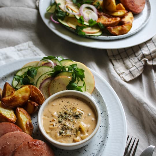 Tre-i-ett-glace grillad karré med potatissallad och syrlig rotfruksallad