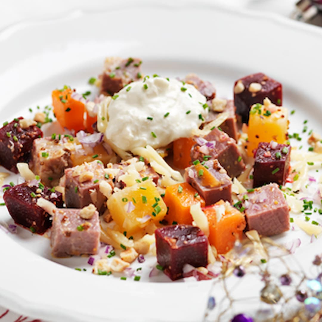 5. Servera salladen med en klick pepparrotscrème på toppen, gräslök, ost och nötter.