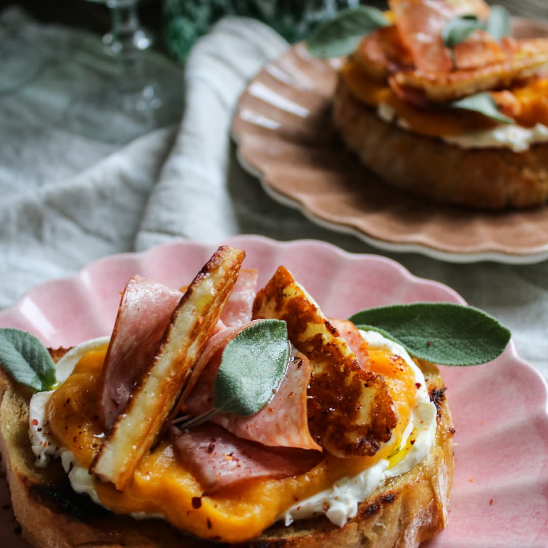 Grunda brödet med färskost, klicka på pumpacreme och toppa med haloumi, salami och vackra färska örter.