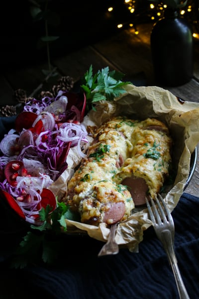 Dijon- och prästostgratinerad julkorv med krispig rödbetor sallad