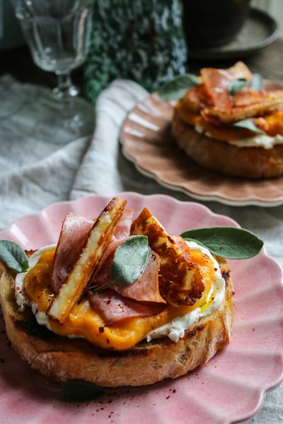 Grunda brödet med färskost, klicka på pumpacreme och toppa med haloumi, salami och vackra färska örter.