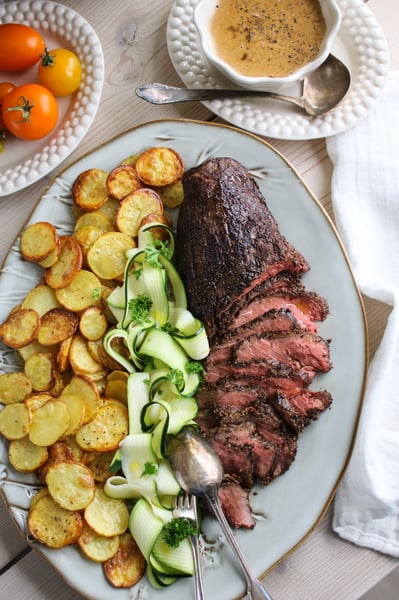 Stek köttet till fin färg runt om. Lägg köttet i en ugnsform och stek klart i ugnen till en innertemperatur på 56-58 grader för rosa kött. Låt köttet vila minst 15 minuter innan det skärs i tunna skivor.