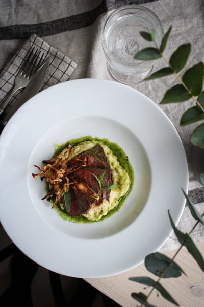 Servera köttet ovanpå den lena purén, nappera med oljan och toppa med krisp!