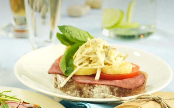 Skiva nötrullen. Blanda rotsellerin med crème fraiche, majonnäs, senap och oliver. Smaka av med salt och peppar. Lägg nötrulle, potatis och tomat på brödskivan. Toppa med rotselleriröran.