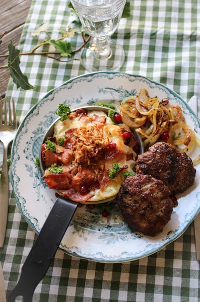 Portionsgratänger med finhackad bacon, toppade med rostad lök till pannbiff