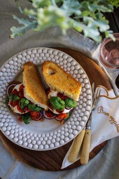 Saftig burgare med fräsch tomat/basilika sallad, mozzarella i vitlöksrostat bröd