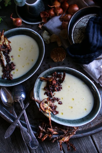 Servera soppan toppad med lite citronzest, örter, baconströssel och eventuellt krispigt rostade potatisskal.