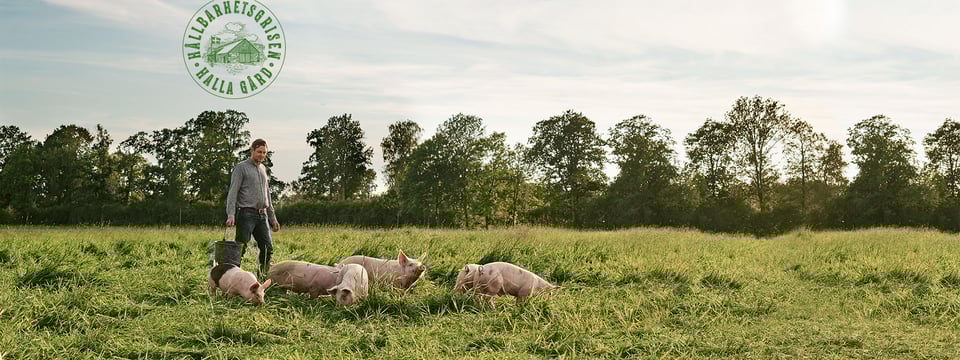 Under 2019 startade vi Gårdsinitiativet – ett samarbete med svenska gårdar för att skapa klimatpositiva effekter utifrån varje gårds förutsättningar. En av våra pilotgårdar inom Gårdsinitiativet är Halla Gård och här sker innovationer på hög nivå. Anders Gunnarsson är en visionär som tänker både nytt och stort och tar sina idéer hela vägen. Under 2020 har han invigt sina nya och helt unika stallar som är både energieffektiva, moderna och inredda på ett sätt som ger grisarna möjlighet att bo tillsammans i stora grupper, springa omkring och får möjlighet att gå ut i den anslutande hagen när de vill! Här kan de böka och beta fritt året runt. På de omkringliggande åkrarna odlar Anders blommande grödor för att öka den biologiska mångfalden. På Halla gård skapas förutsättningar för ett välfungerande kretslopp som ger gården en lägre påverkan på klimatet.